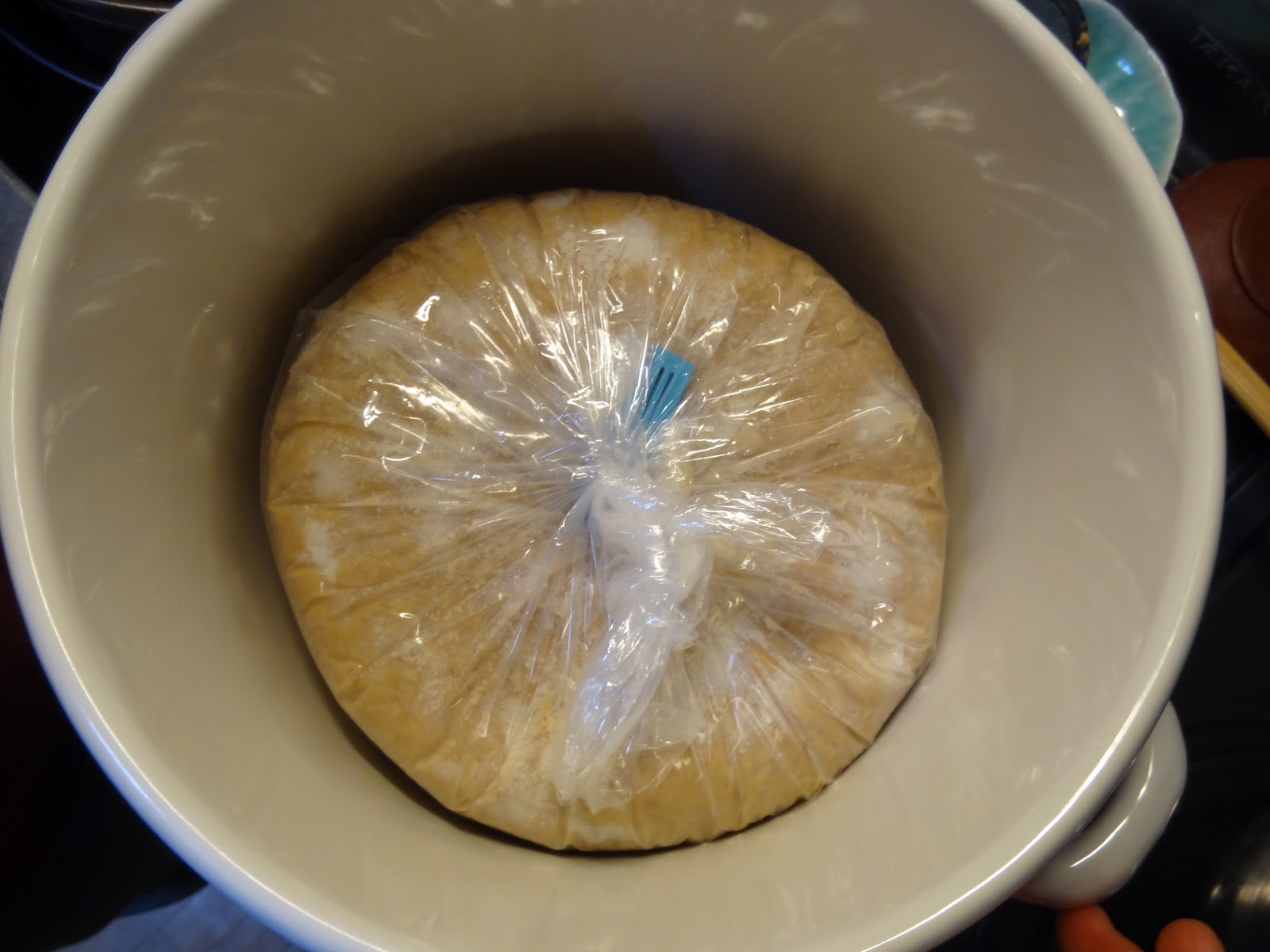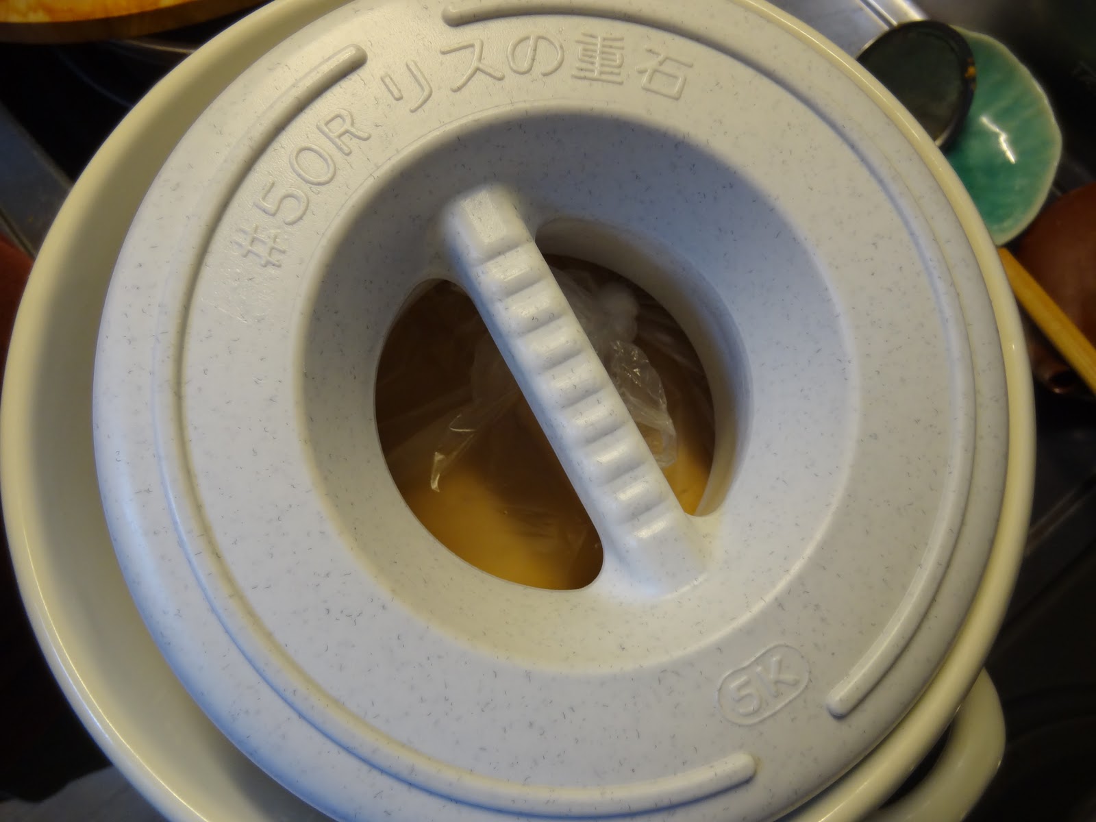 Pode-se usar um saco plastico, mas de qualquer maneira deve-se desinfetar com água fervente ou como se faz aqui usando shochu (aguardente de 25 graus de teor alcoólico) no pote a ser usado.